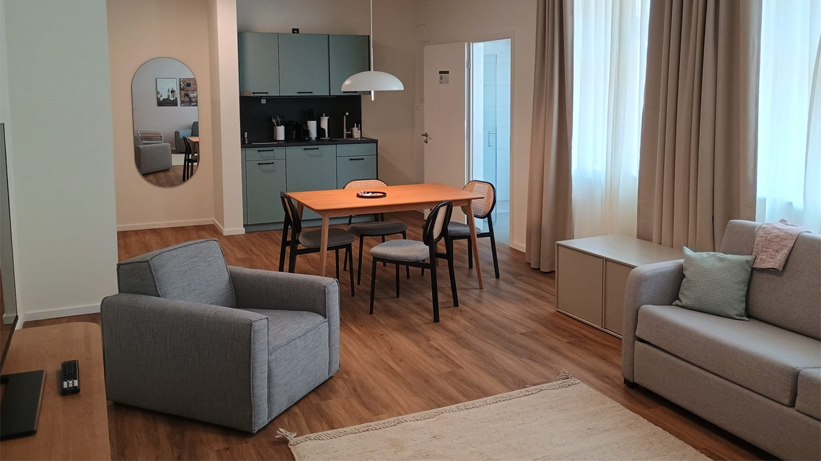 Ein zentraler Bestandteil des Projekts ist zudem die Einrichtung eines modernen Apartmenthotels. Dieses umfasst 47 Zimmer und folgt dem sogenannten Long-Stay-Living-Konzept, das sich insbesondere an Geschäftsreisende, Pendler und Gäste mit längerem Aufenthaltsbedarf richtet. Die Apartments sind entsprechend ausgestattet und bieten eine Kombination aus Hotelkomfort und wohnlicher Atmosphäre.