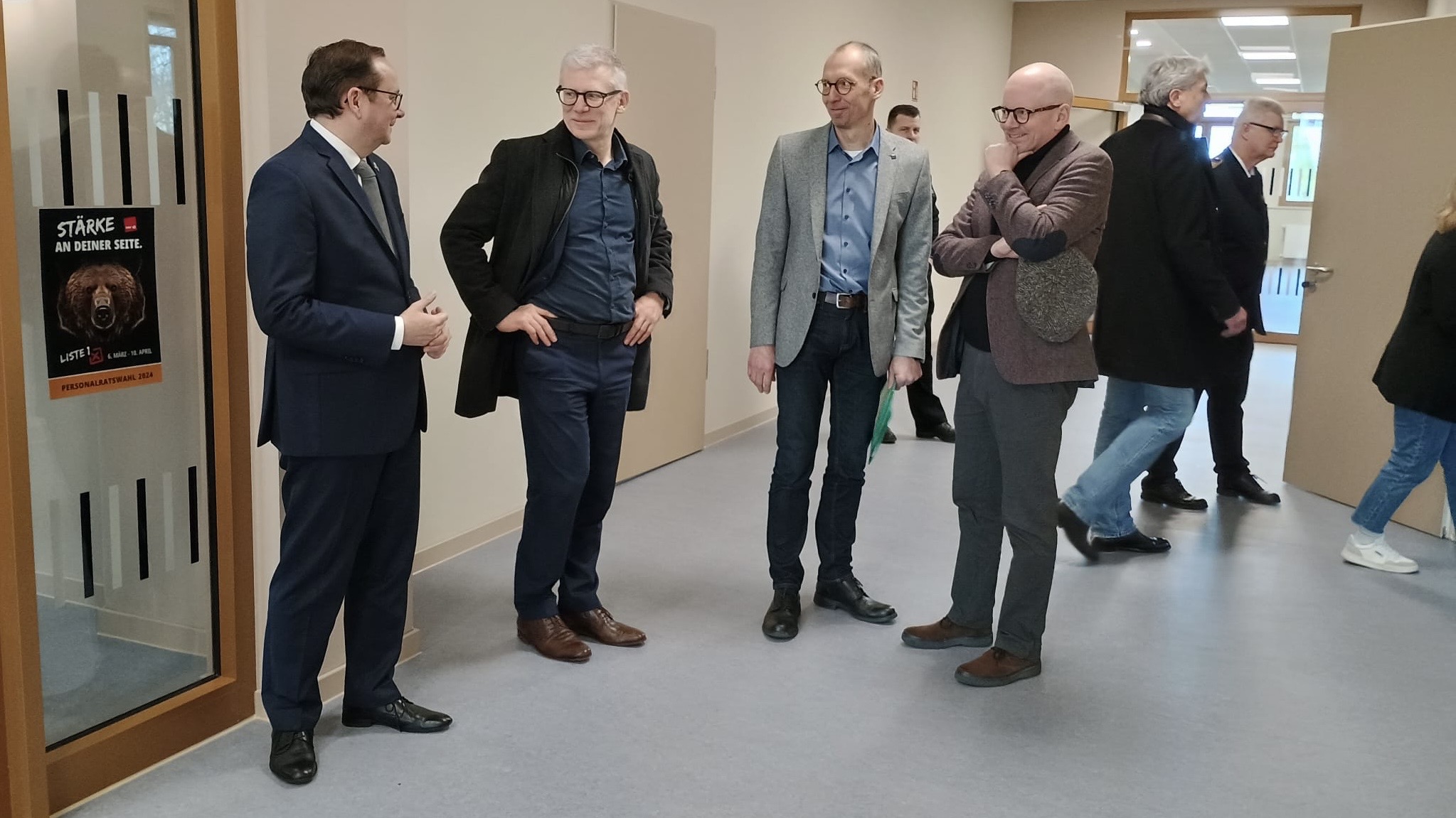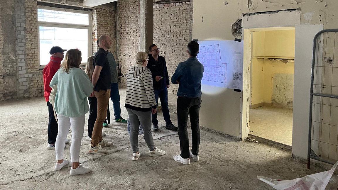 Der Frankfurter Investor Smartimmo besucht im Rahmen seines jährlichen Büroausflugs die Baustelle in Gelsenkirchen-Buer. Dr. Schramm Michael Partner führen die begeisterten Besucher durch das Gebäude und informieren umfangreich über die Planung und die rasch voranschreitenden Arbeiten. Was bisher nur graue Theorie war wird nun zu einem lebhaften und stimmigen Bild.