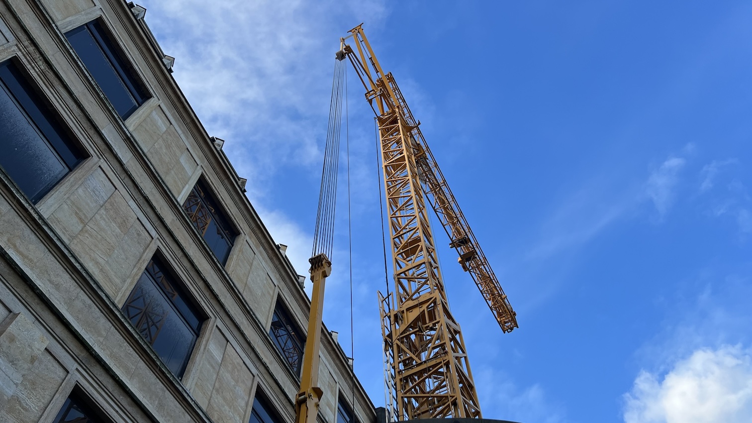 Der Umbau und die Sanierung des ehemaligen Kaufhauses Weiser in der Hochstraße 7 nehmen nun sichtbare Formen an. Seit heute steht der Baukran. In dem in den Jahren von 1927 bis 1928 errichteten Bauwerk wird in naher Zukunft ein Apartmenthotel nach dem Longstay-Living-Konzept einziehen.