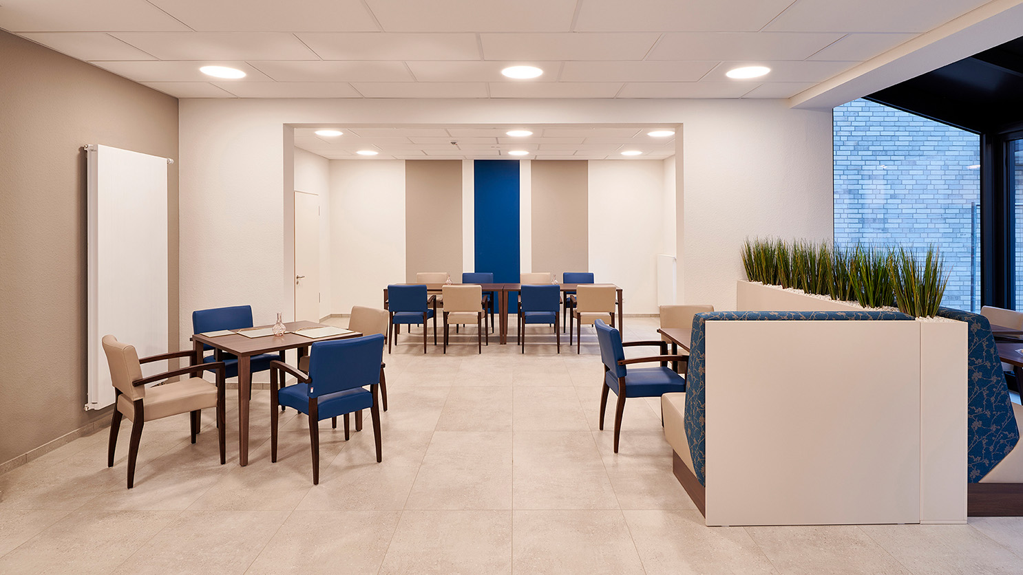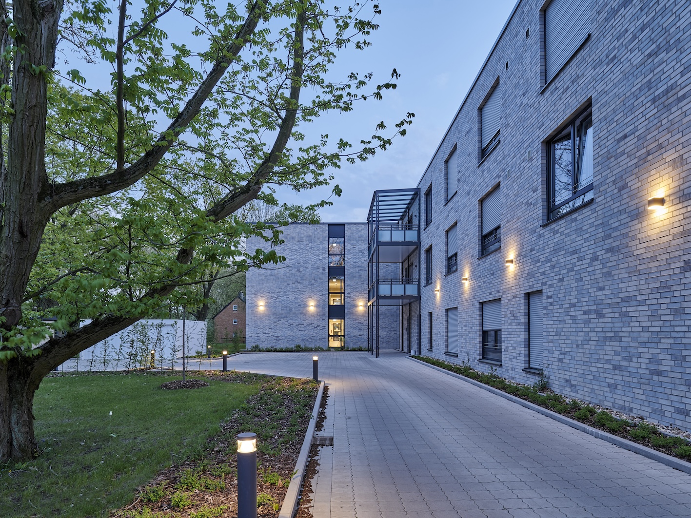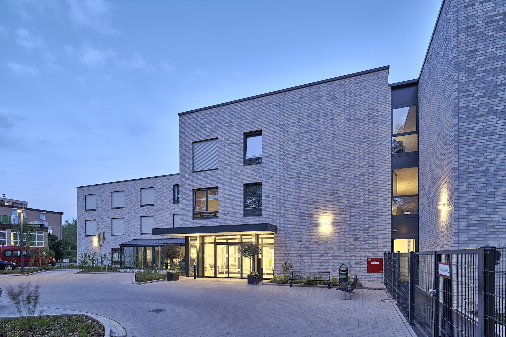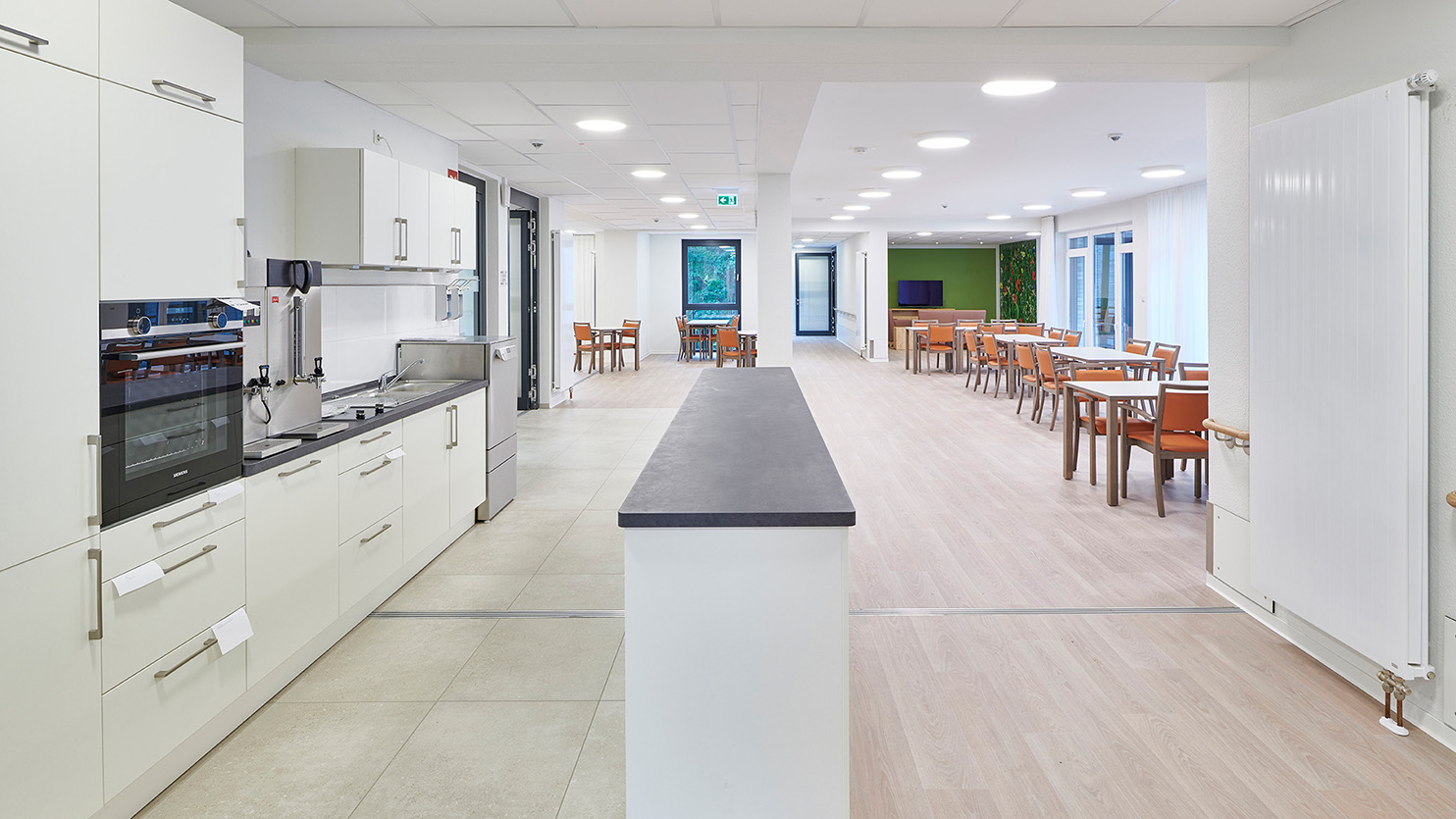 Dieser Neubau eines Altenpflegeeinrichtungsgebäudes bietet 80 pflegebedürftigen Menschen ein neues Zuhause. Das vollständig barrierefrei und rollstuhlgerecht geplante Gebäude ermöglicht ihnen eine professionelle Pflege und soziale Betreuung. Die Erhaltung der Selbständigkeit jedes einzelnen Bewohners ist durch die Größe und Ausstattung der Bewohnerzimmer gewährleistet. Alle Zimmer sind Einzelzimmer und verfügen über ein rollstuhlgerechtes und somit großzügiges Bad. Auch in ihrer Mobilität eingeschränkten Personen wird ein maximaler Wohnkomfort geboten.