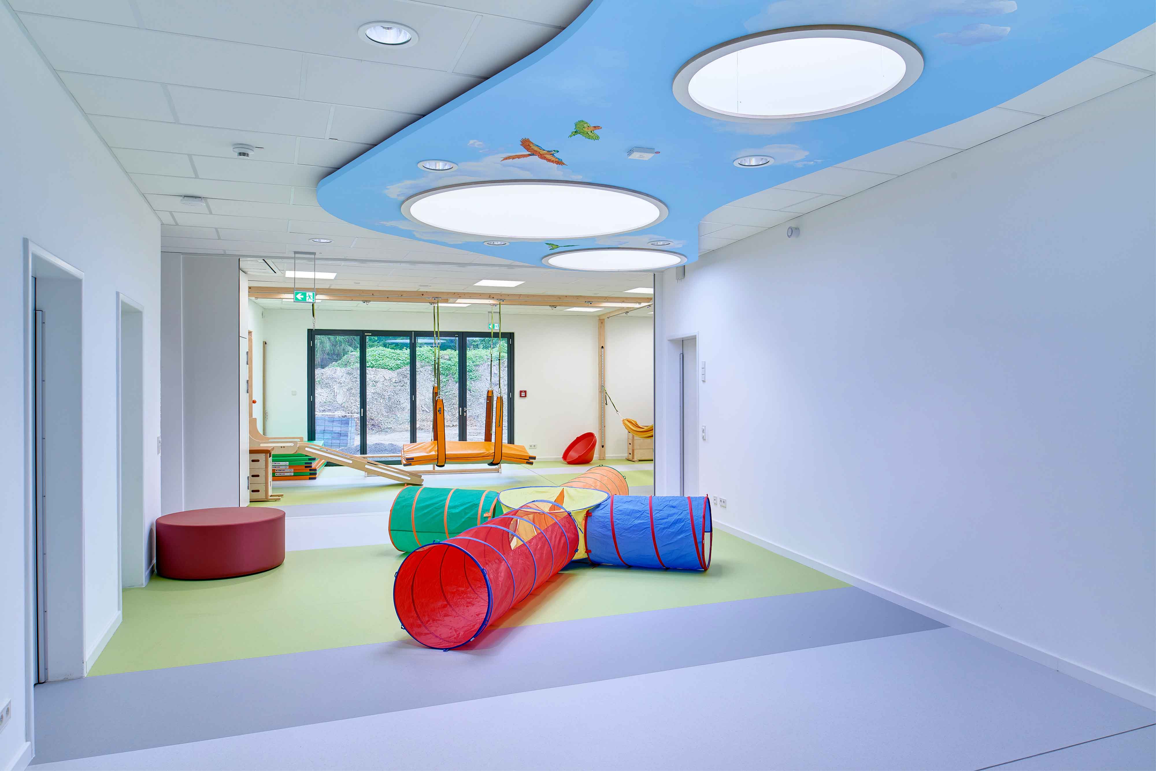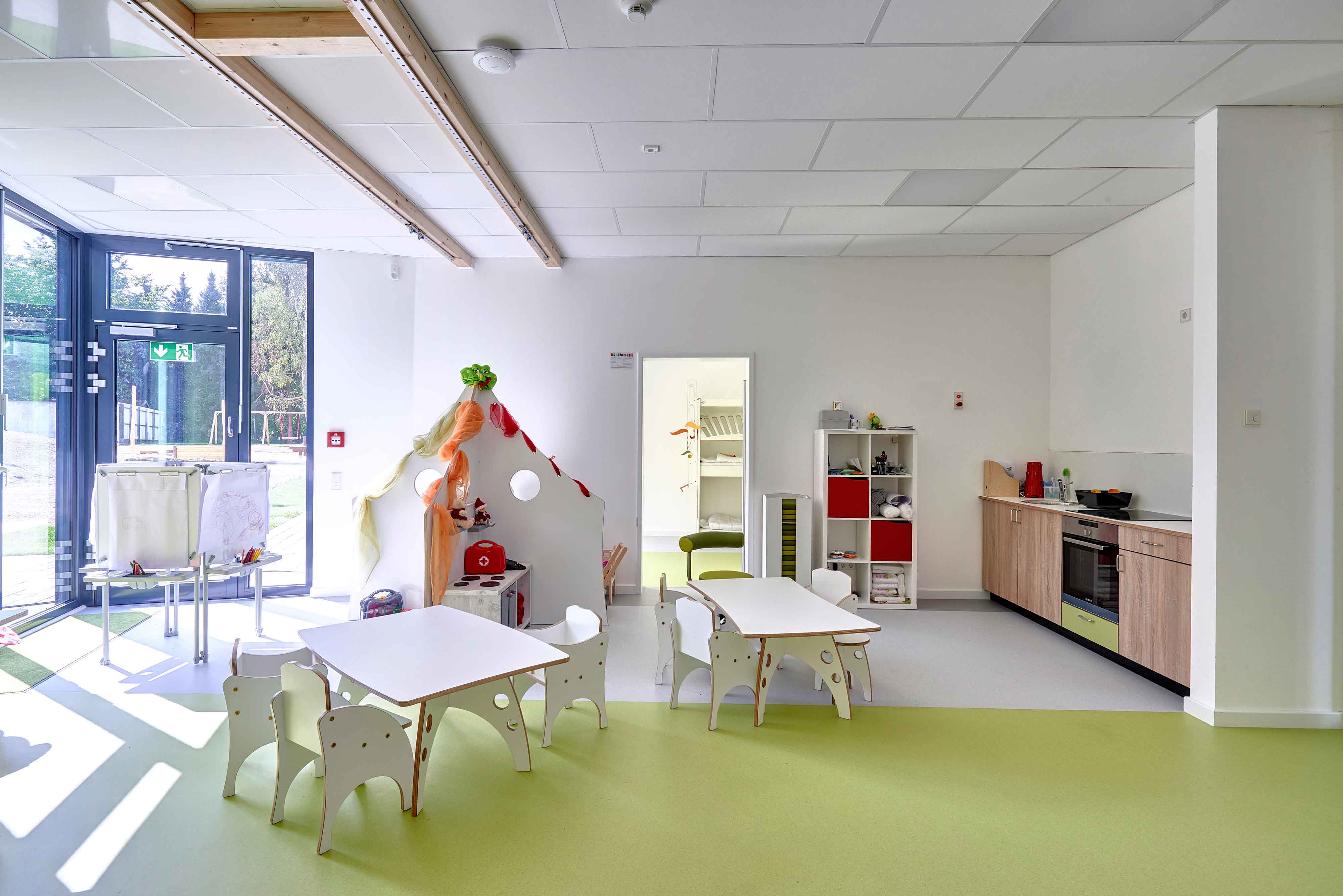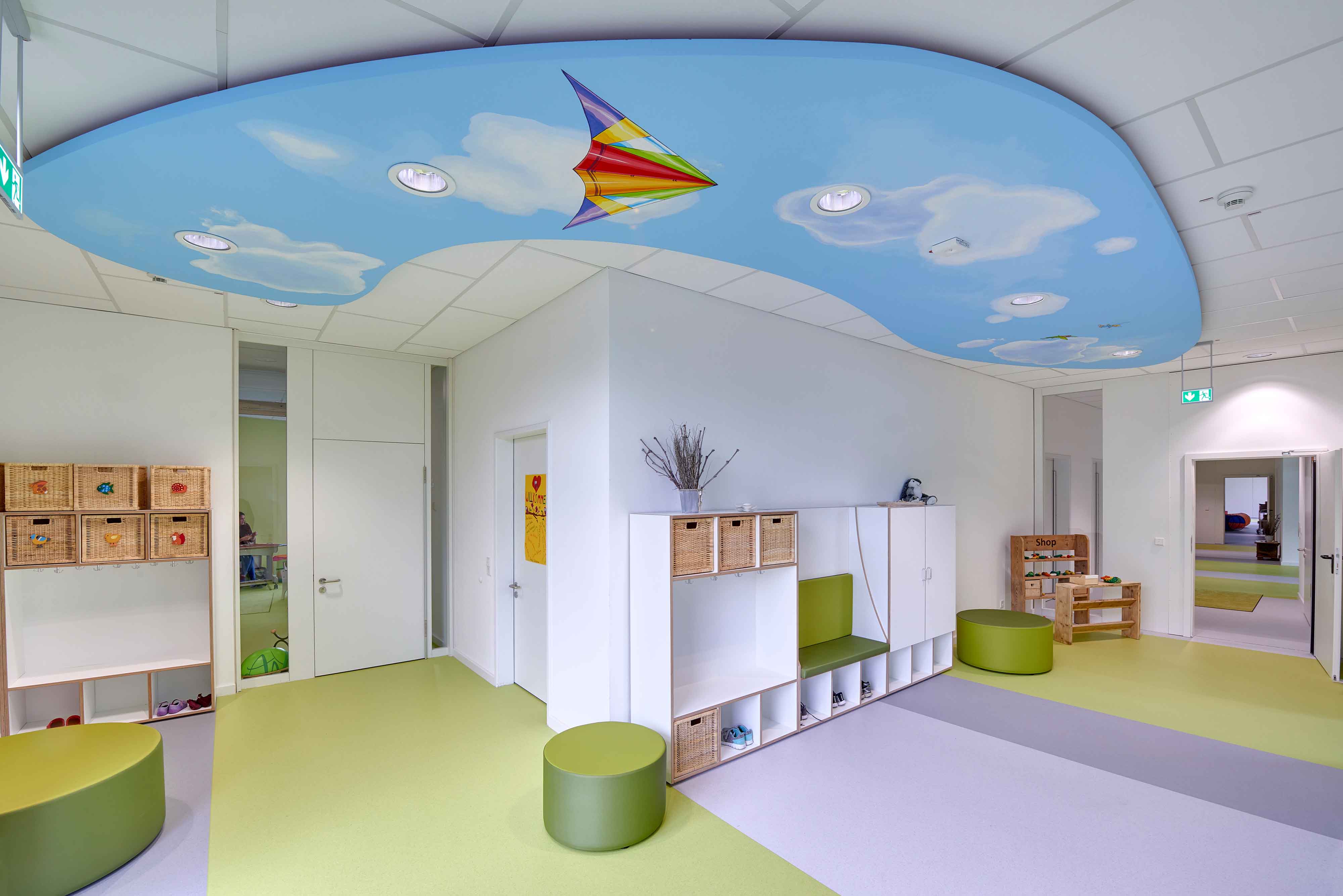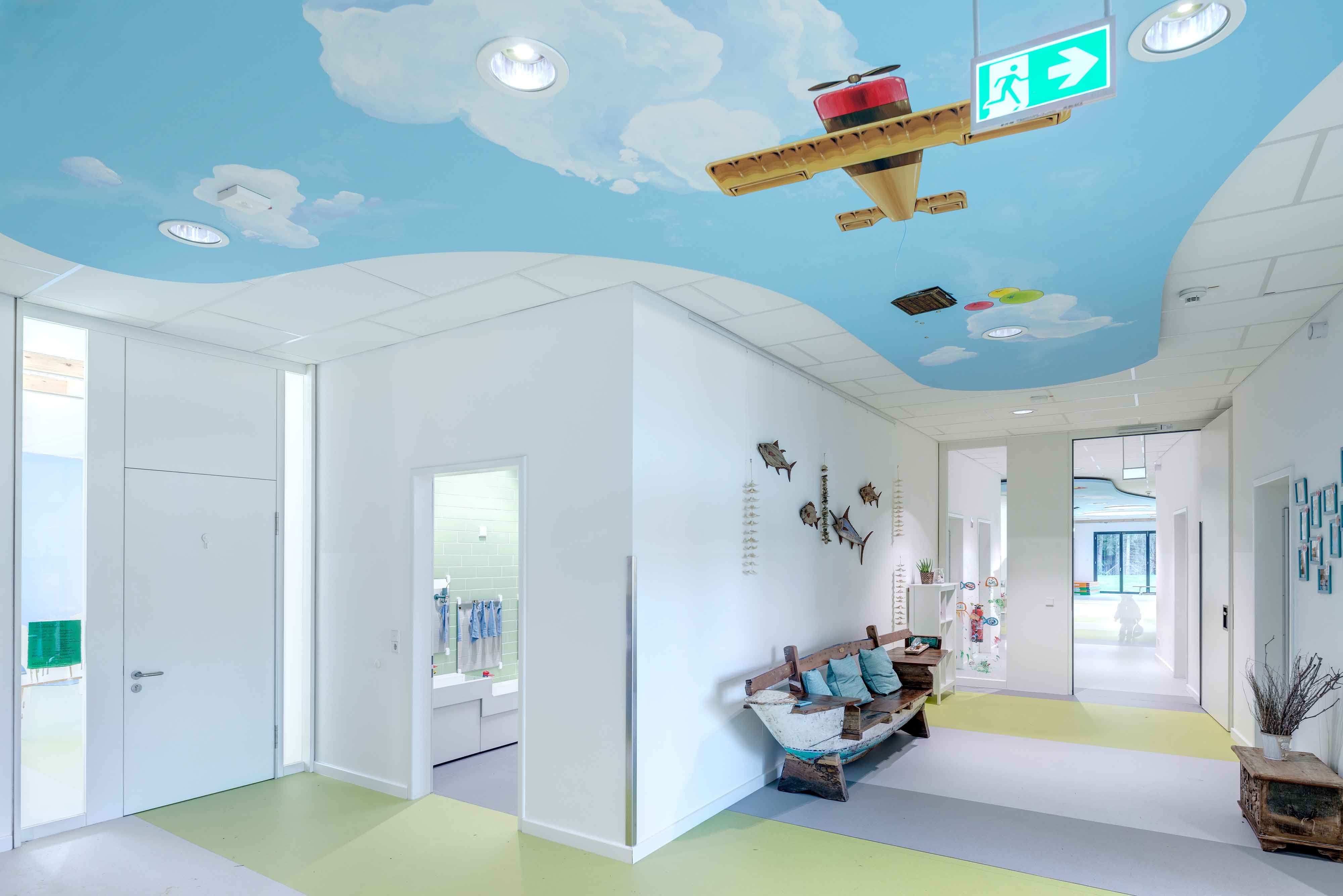 Der große Flurbereich, von dem aus die Gruppenräume erschlossen werden, ermöglicht mit seiner natürlichen Belichtung und seiner ansprechenden Gestaltung das gemeinsame Spielen und Aufwachsen der Kinder. Sie haben so die große Chance, ohne Vorurteile und Berührungsängste eine Gemeinschaft zu erleben.