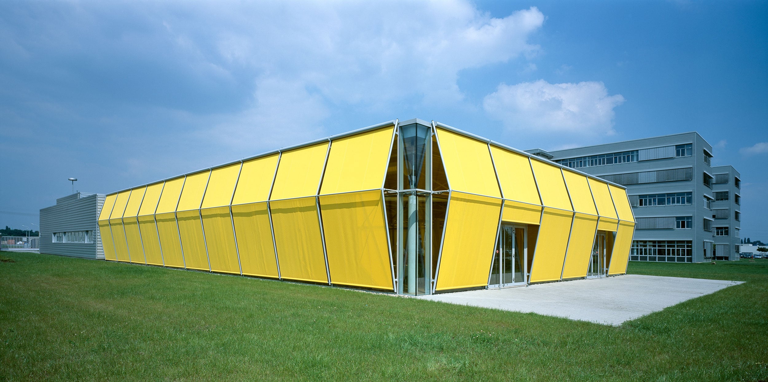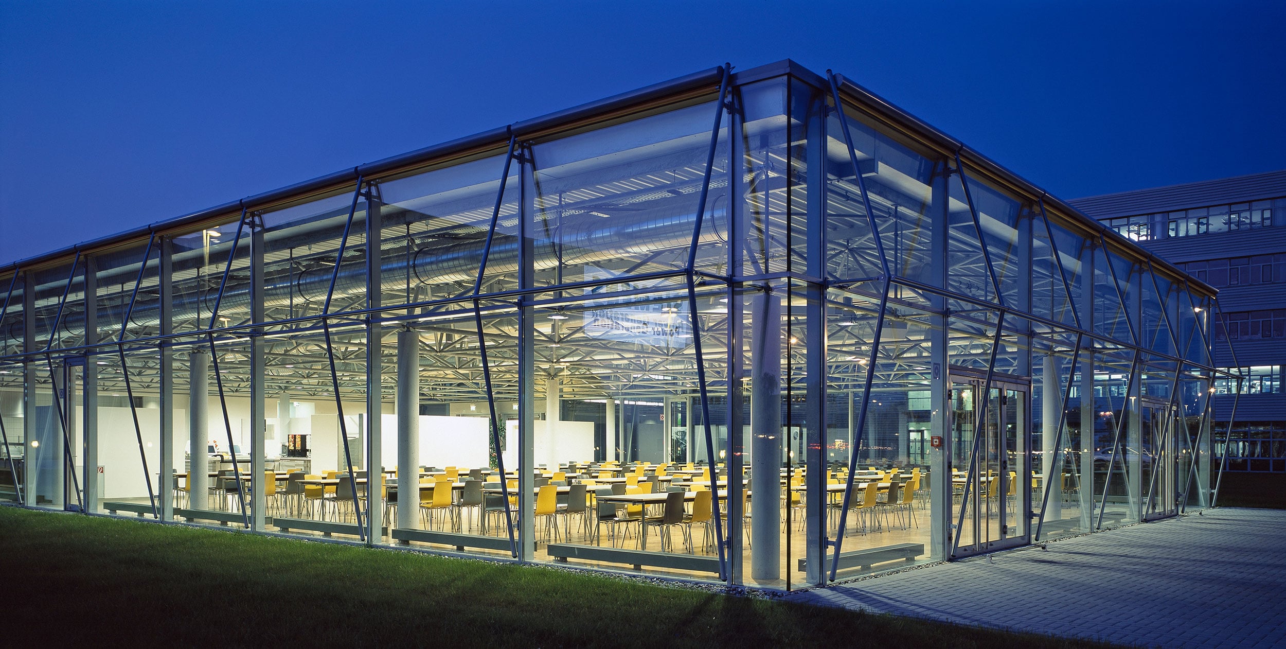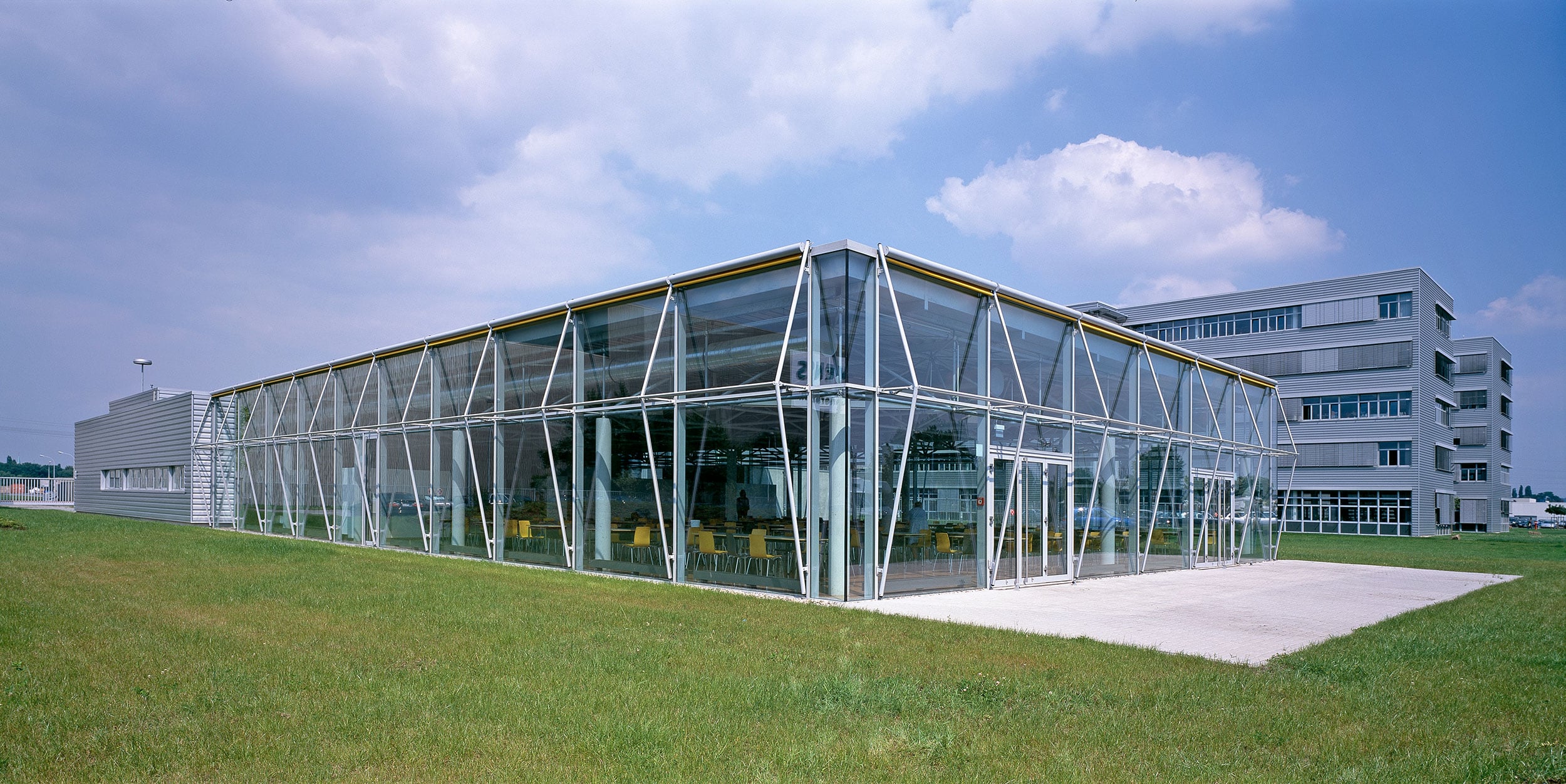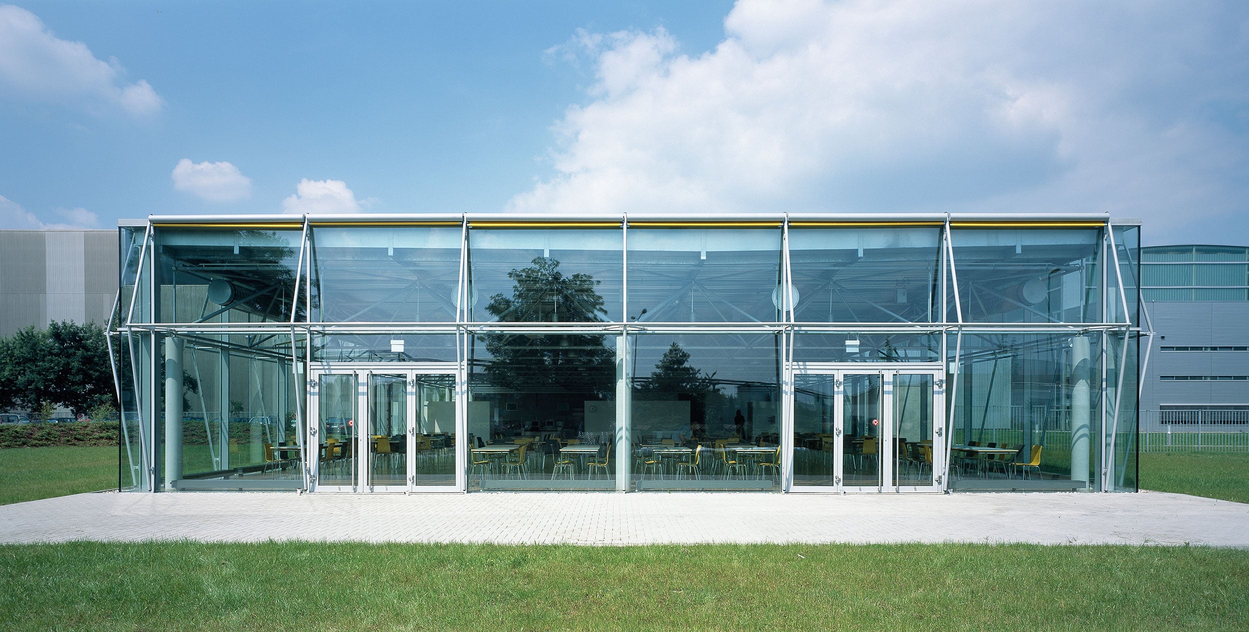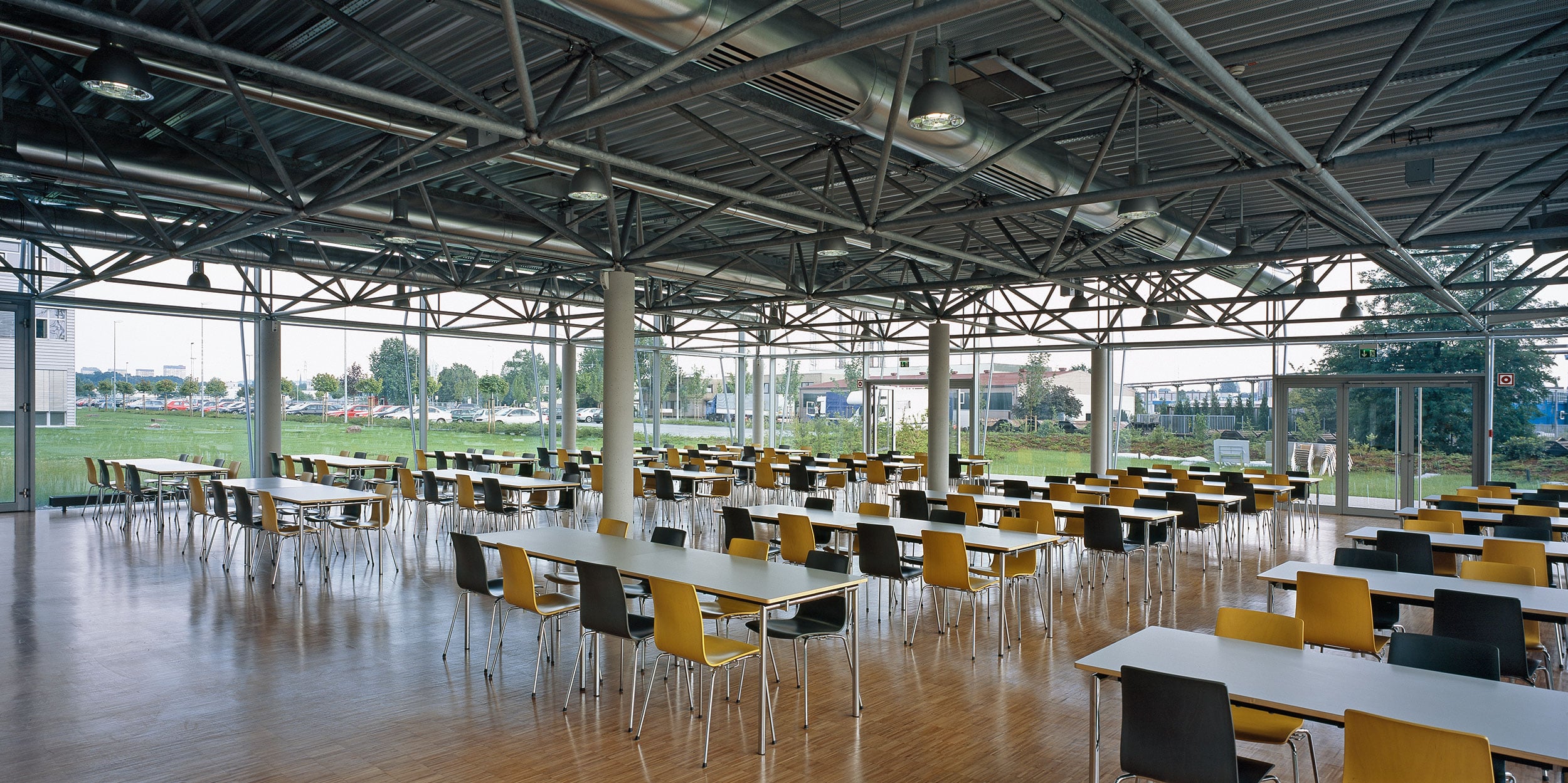 Innerhalb des Technologieparks der Siemens AG in Mülheim an der Ruhr entstand diese offen gestaltete Betriebskantine mit Speisesaal und Küche. Das räumliche Tragwerk, das punktuell auf einigen wenigen Betonstützen lastet, ermöglicht einen großzügigen Grundriss. Die hierdurch erreichte zwanglose Gestaltung des Speisesaals wird durch eine komplett verglaste Fassade unterstützt, sodass Außen und Innen miteinander verschmelzen. Der sommerliche Sonnenschutz wird mit Hilfe der großformatigen Fassadenrollos erreicht, die aufgrund ihrer, auf Distanz zur Fassade gehaltenen, Führungsschienen, die Belichtung mit Tageslicht weiterhin zulassen und dennoch für eine ausreichende Verschattung der Glasfassade sorgen. Die Farbgestaltung der Sonnenschutzrollos sorgt hierbei für ein angenehmes und freundliches Ambiente im Inneren.