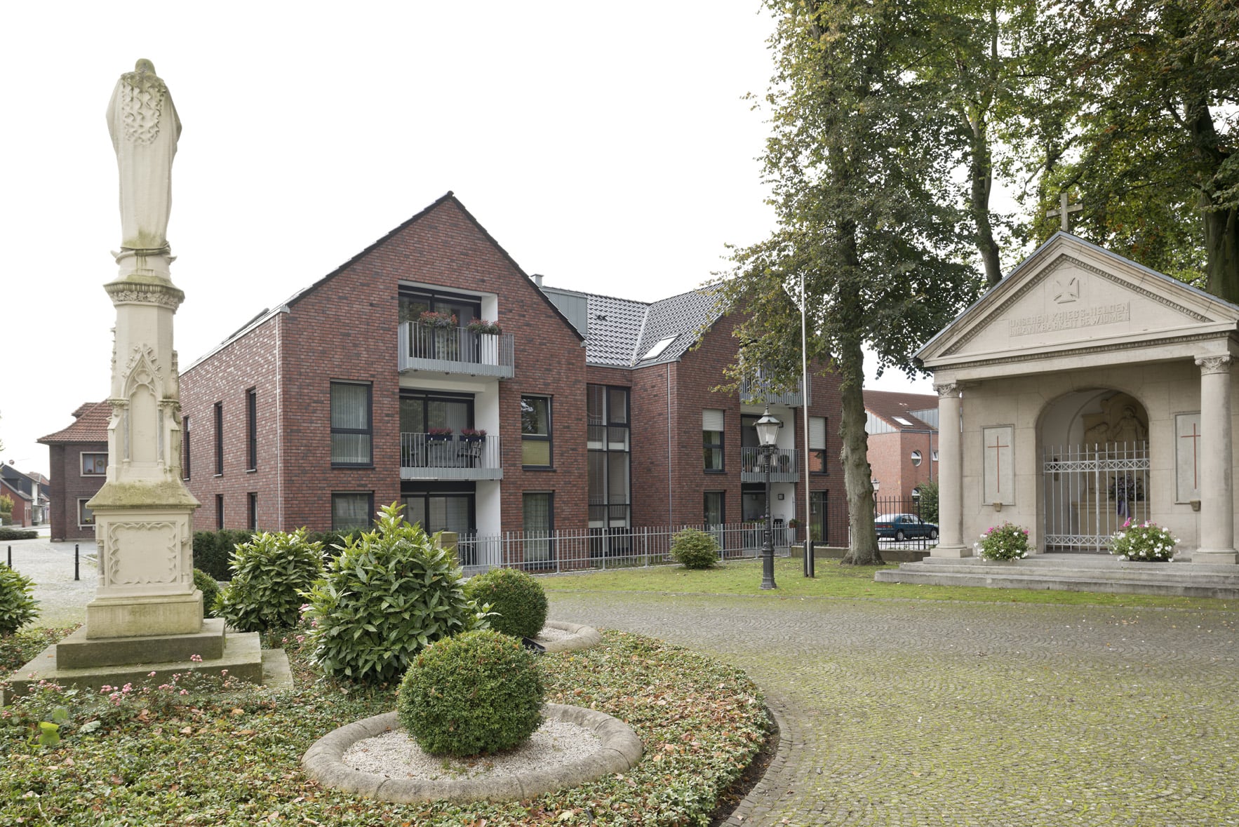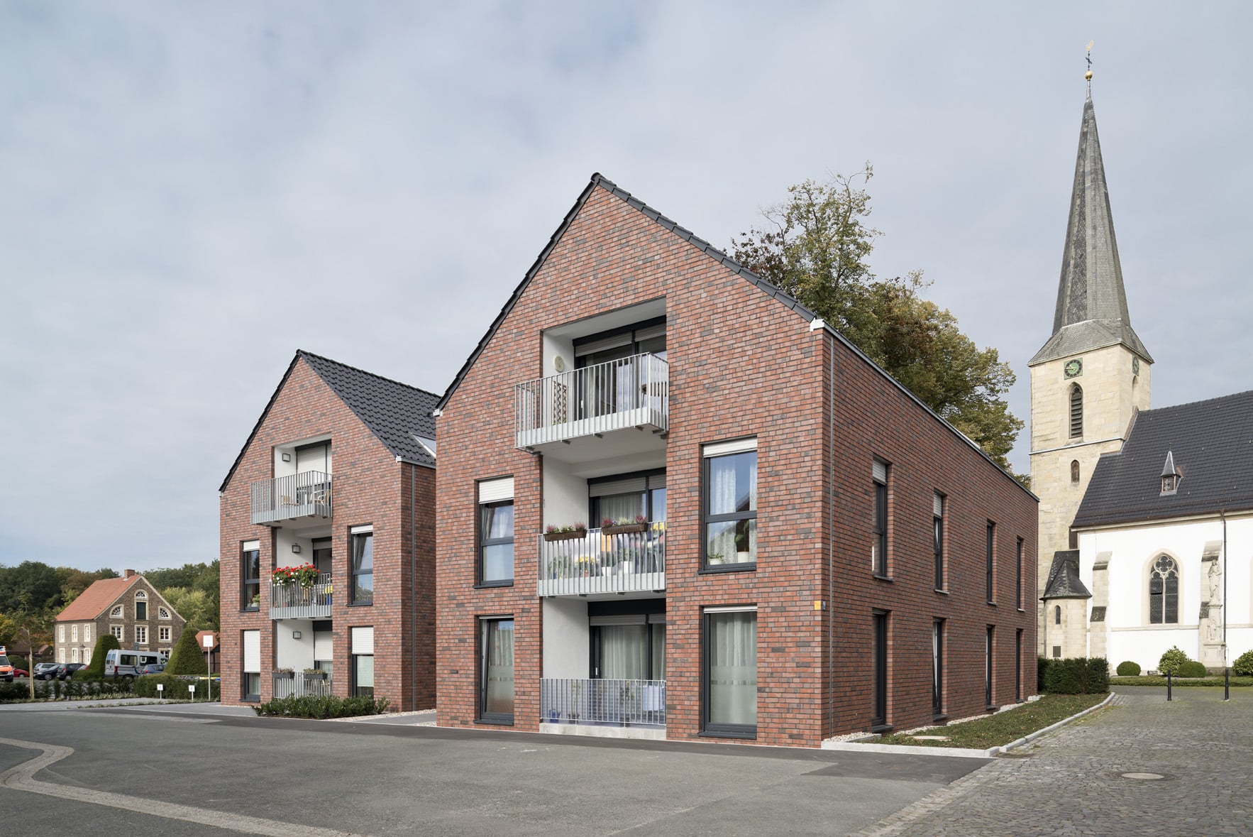 Der an das Bauvorhaben direkt angrenzende Frenkings Hof ist ein Beispiel der typisch münsterländischen Bauweise und bildet heute, als Bürgerzentrum genutzt, den Mittelpunkt für kulturelle und gemeinschaftliche Veranstaltungen von Bürgern und Vereinen. Viele der historischen Gebäude verleihen dem Ort einen unverwechselbaren Charme, der, so das Verständnis der Planer, durch den Neubau nicht gestört werden sollte. Durch die Wahl der Klinkerfassade und die Gliederung des Gebäudes in zwei Baukörper, die sich in Größe und Form in die Altstadt einfügen, wird eine Harmonie zwischen alt und neu erreicht. Das Bauvorhaben umfasst 12 altengerechte und barrierefreie Wohnungen zwischen 46 und 65 m2 auf 3 Etagen. Die Wohnungen haben einen bedarfsgerechten, individuellen Zuschnitt mit einer eigenen Loggia und eine hochwertige, barrierefreie Bauausführung mit Liebe zum Detail. Großzügig gestaltete grüne Wohnumfeld mit vielfältigen Gemeinschafts- und Parkflächen wurden ebenfalls geschaffen.